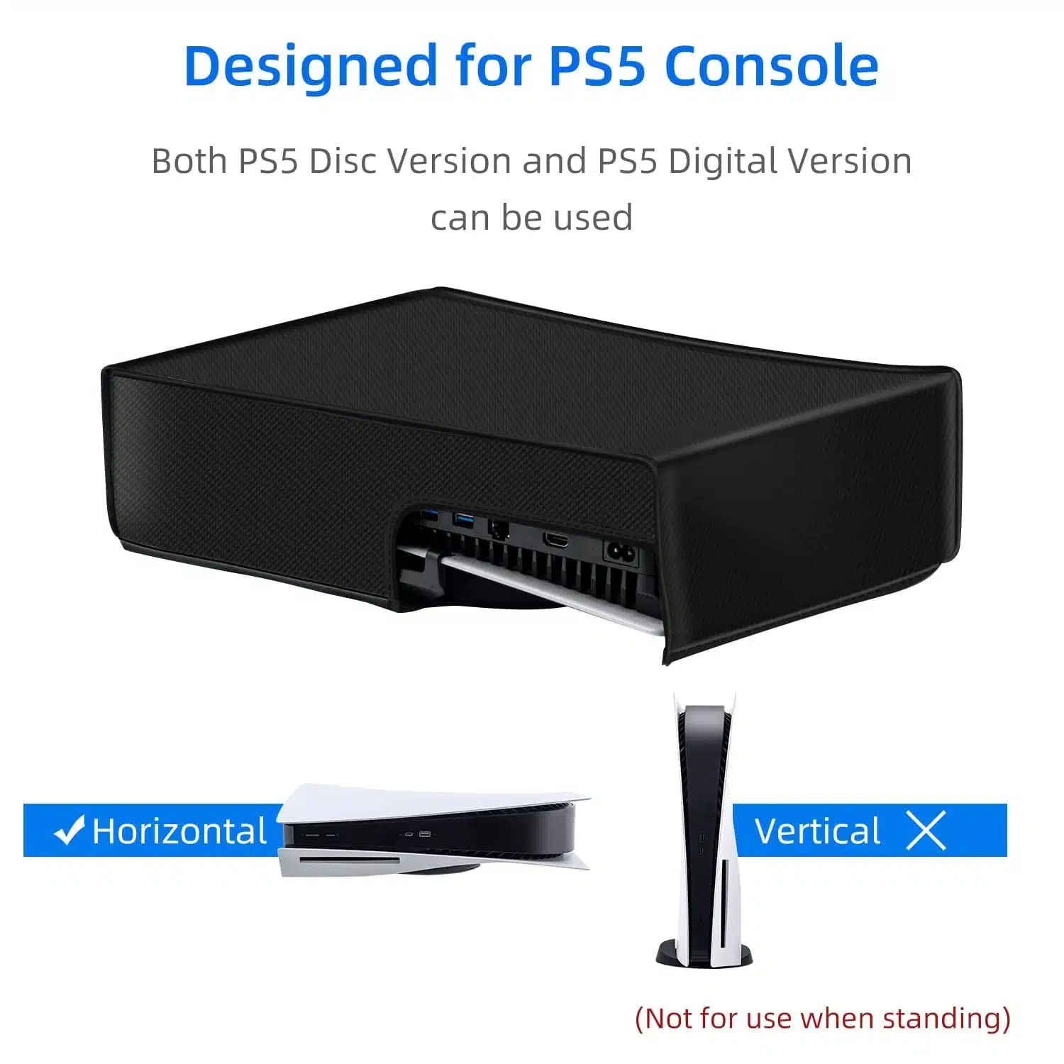 - Housse anti-poussière spécialement conçue pour les consoles PS5 Digital Edition et Ultra HD en mode horizontal uniquement.